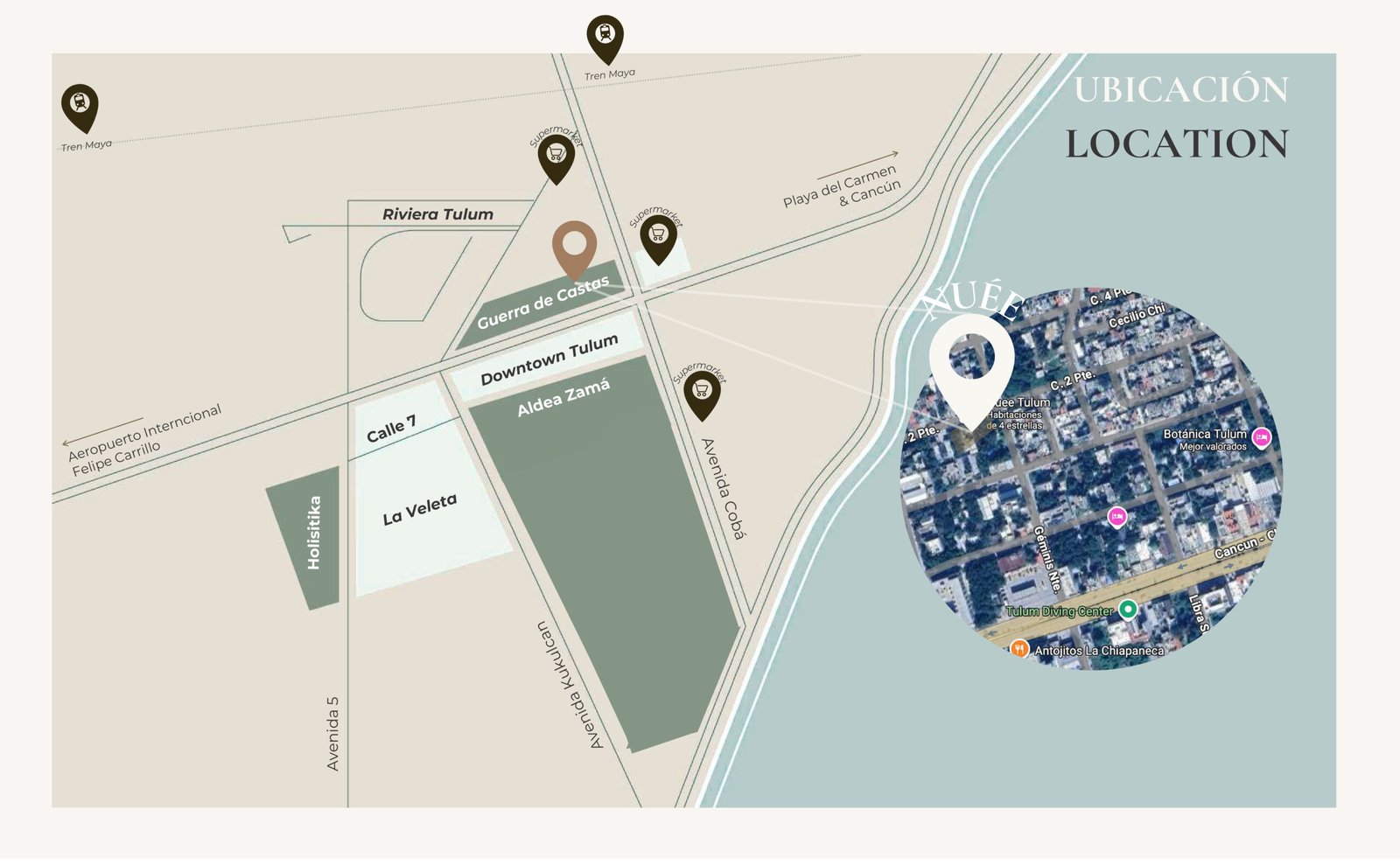 Ubicado estratégicamente en el centro activo de Tulum, NUÉE te sitúa a pasos de restaurantes vibrantes, servicios esenciales, áreas verdes y emblemáticos cenotes. A pocos minutos de la estación del Tren Maya y del nuevo Aeropuerto Internacional de Tulum, esta ubicación privilegiada garantiza una conectividad incomparable y prometedor crecimiento.